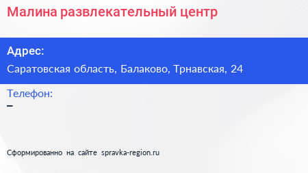 Малина, развлекательный центр по адресу Саратовская область, Балаково, Трнавская, 24 в дальнейшем Организация, размещена в следующих категориях: