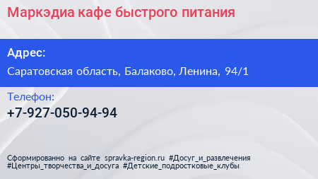 Маркэдиа, кафе быстрого питания по адресу Саратовская область, Балаково, Ленина, 94/1 в дальнейшем Организация, размещена в следующих категориях: