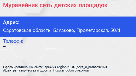 Муравейник, сеть детских площадок по адресу Саратовская область, Балаково, Пролетарская, 50/1 в дальнейшем Организация, размещена в следующих категориях: