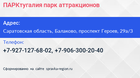 ПАРКтугалия, парк аттракционов по адресу Саратовская область, Балаково, проспект Героев, 29а/3 в дальнейшем Организация, размещена в следующих категориях: