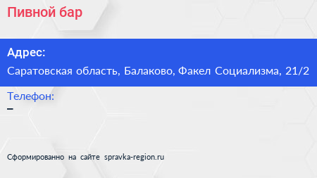 Пивной бар по адресу Саратовская область, Балаково, Факел Социализма, 21/2 в дальнейшем Организация, размещена в следующих категориях: