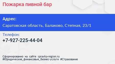 Пожарка, пивной бар по адресу Саратовская область, Балаково, Степная, 23/1 в дальнейшем Организация, размещена в следующих категориях: