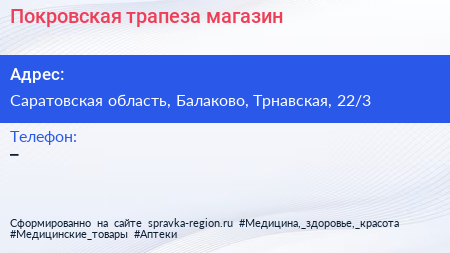 Покровская трапеза, магазин по адресу Саратовская область, Балаково, Трнавская, 22/3 в дальнейшем Организация, размещена в следующих категориях: