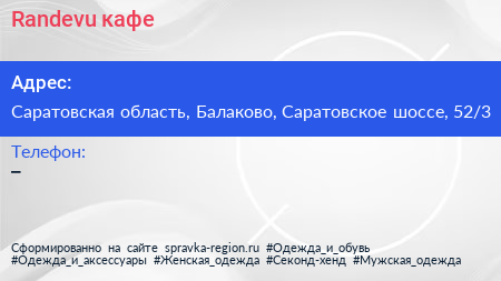 Randevu, кафе по адресу Саратовская область, Балаково, Саратовское шоссе, 52/3 в дальнейшем Организация, размещена в следующих категориях:
