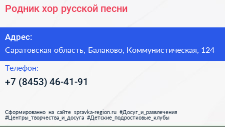Родник, хор русской песни по адресу Саратовская область, Балаково, Коммунистическая, 124 в дальнейшем Организация, размещена в следующих категориях: