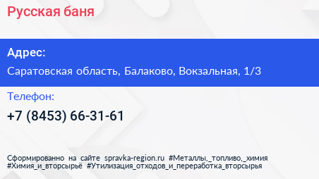 Русская баня по адресу Саратовская область, Балаково, Вокзальная, 1/3 в дальнейшем Организация, размещена в следующих категориях: