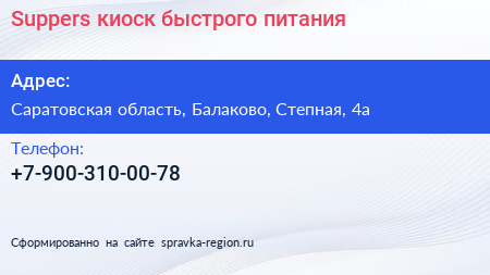 Suppers, киоск быстрого питания по адресу Саратовская область, Балаково, Степная, 4а в дальнейшем Организация, размещена в следующих категориях:
