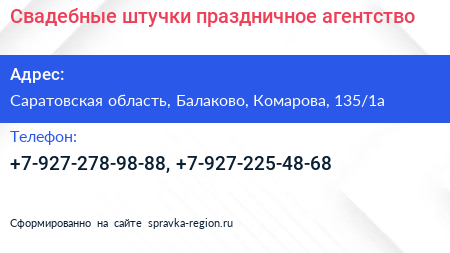Свадебные штучки, праздничное агентство по адресу Саратовская область, Балаково, Комарова, 135/1а в дальнейшем Организация, размещена в следующих категориях: