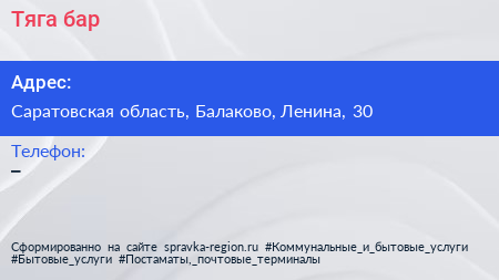 Тяга, бар по адресу Саратовская область, Балаково, Ленина, 30 в дальнейшем Организация, размещена в следующих категориях:
