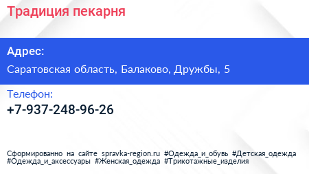 Традиция, пекарня по адресу Саратовская область, Балаково, Дружбы, 5 в дальнейшем Организация, размещена в следующих категориях: