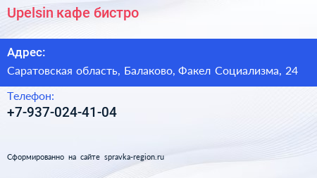 Upelsin, кафе-бистро по адресу Саратовская область, Балаково, Факел Социализма, 24 в дальнейшем Организация, размещена в следующих категориях: