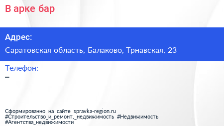 В арке, бар по адресу Саратовская область, Балаково, Трнавская, 23 в дальнейшем Организация, размещена в следующих категориях: