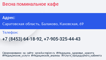 Весна, поминальное кафе по адресу Саратовская область, Балаково, Каховская, 69 в дальнейшем Организация, размещена в следующих категориях: