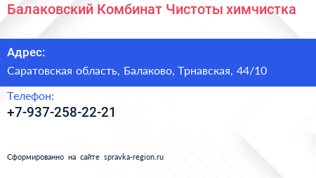 Балаковский Комбинат Чистоты, химчистка по адресу Саратовская область, Балаково, Трнавская, 44/10 в дальнейшем Организация, размещена в следующих категориях: