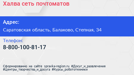 Халва, сеть почтоматов по адресу Саратовская область, Балаково, Степная, 34 в дальнейшем Организация, размещена в следующих категориях: