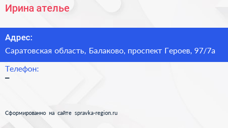 Ирина, ателье по адресу Саратовская область, Балаково, проспект Героев, 97/7а в дальнейшем Организация, размещена в следующих категориях: