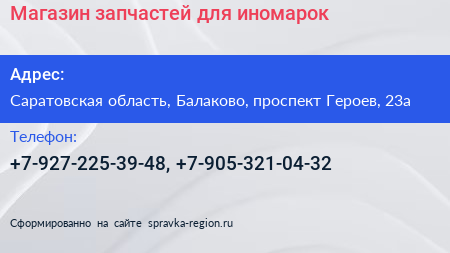 Магазин запчастей для иномарок по адресу Саратовская область, Балаково, проспект Героев, 23а в дальнейшем Организация, размещена в следующих категориях: