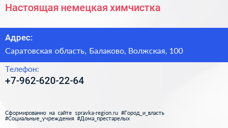 Настоящая немецкая химчистка по адресу Саратовская область, Балаково, Волжская, 100 в дальнейшем Организация, размещена в следующих категориях: