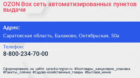 OZON Box, сеть автоматизированных пунктов выдачи по адресу Саратовская область, Балаково, Октябрьская, 50а в дальнейшем Организация, размещена в следующих категориях: