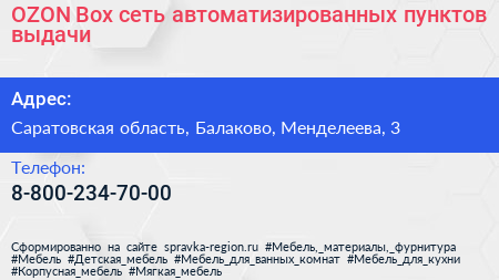 OZON Box, сеть автоматизированных пунктов выдачи по адресу Саратовская область, Балаково, Менделеева, 3 в дальнейшем Организация, размещена в следующих категориях: