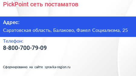 PickPoint, сеть постаматов по адресу Саратовская область, Балаково, Факел Социализма, 25 в дальнейшем Организация, размещена в следующих категориях: