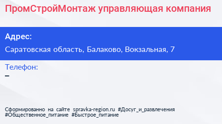 ПромСтройМонтаж, управляющая компания по адресу Саратовская область, Балаково, Вокзальная, 7 в дальнейшем Организация, размещена в следующих категориях: