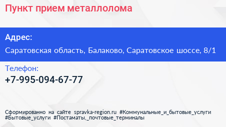 Пункт прием металлолома по адресу Саратовская область, Балаково, Саратовское шоссе, 8/1 в дальнейшем Организация, размещена в следующих категориях: