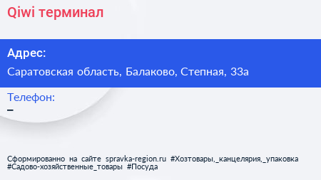 Qiwi, терминал по адресу Саратовская область, Балаково, Степная, 33а в дальнейшем Организация, размещена в следующих категориях: