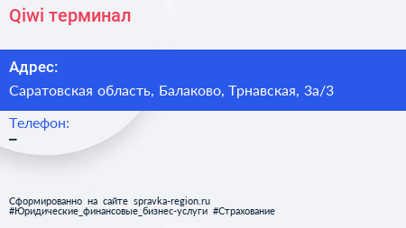 Qiwi, терминал по адресу Саратовская область, Балаково, Трнавская, 3а/3 в дальнейшем Организация, размещена в следующих категориях: