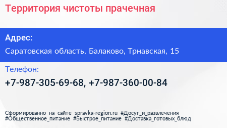 Территория чистоты, прачечная по адресу Саратовская область, Балаково, Трнавская, 15 в дальнейшем Организация, размещена в следующих категориях: