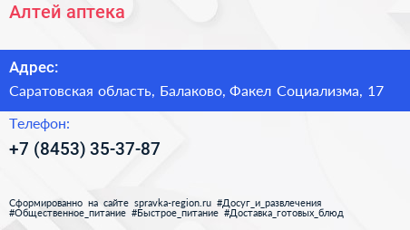 Алтей, аптека по адресу Саратовская область, Балаково, Факел Социализма, 17 в дальнейшем Организация, размещена в следующих категориях: