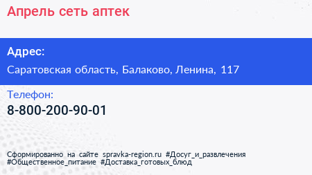 Апрель, сеть аптек по адресу Саратовская область, Балаково, Ленина, 117 в дальнейшем Организация, размещена в следующих категориях: