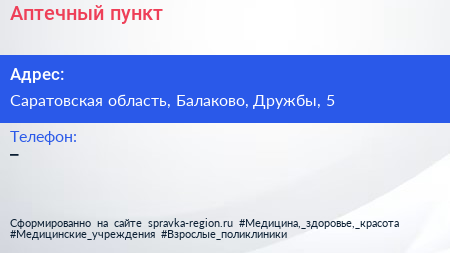 Аптечный пункт по адресу Саратовская область, Балаково, Дружбы, 5 в дальнейшем Организация, размещена в следующих категориях: