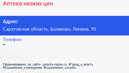 Аптека низких цен по адресу Саратовская область, Балаково, Ленина, 95 в дальнейшем Организация, размещена в следующих категориях:
