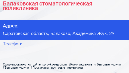 Балаковская стоматологическая поликлиника по адресу Саратовская область, Балаково, Академика Жук, 29 в дальнейшем Организация, размещена в следующих категориях: