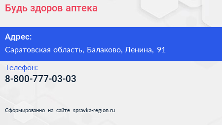 Будь здоров!, аптека по адресу Саратовская область, Балаково, Ленина, 91 в дальнейшем Организация, размещена в следующих категориях: