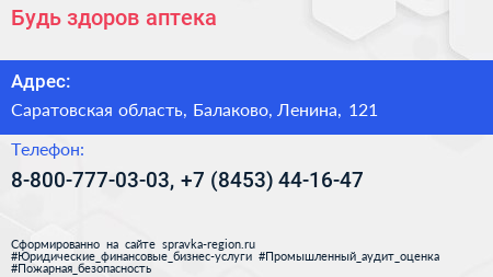 Будь здоров!, аптека по адресу Саратовская область, Балаково, Ленина, 121 в дальнейшем Организация, размещена в следующих категориях: