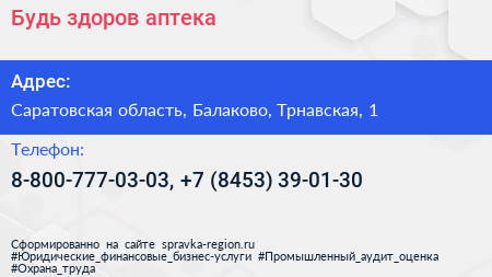 Будь здоров!, аптека по адресу Саратовская область, Балаково, Трнавская, 1 в дальнейшем Организация, размещена в следующих категориях: