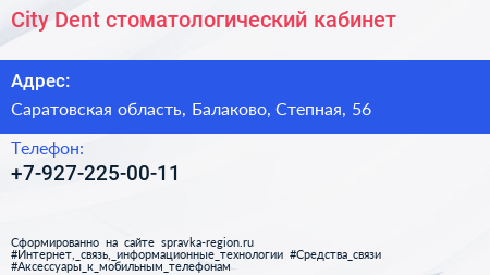 City Dent, стоматологический кабинет по адресу Саратовская область, Балаково, Степная, 56 в дальнейшем Организация, размещена в следующих категориях: