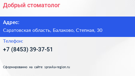 Добрый стоматолог по адресу Саратовская область, Балаково, Степная, 30 в дальнейшем Организация, размещена в следующих категориях: