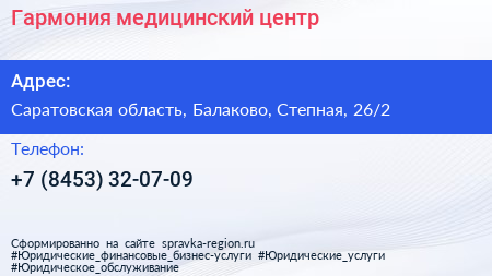 Гармония, медицинский центр по адресу Саратовская область, Балаково, Степная, 26/2 в дальнейшем Организация, размещена в следующих категориях: