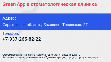 Green Apple, стоматологическая клиника по адресу Саратовская область, Балаково, Трнавская, 27 в дальнейшем Организация, размещена в следующих категориях: