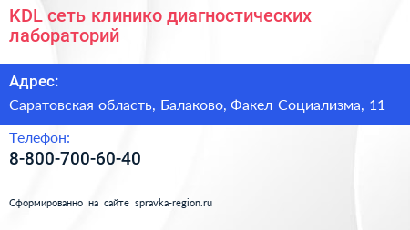 KDL, сеть клинико-диагностических лабораторий по адресу Саратовская область, Балаково, Факел Социализма, 11 в дальнейшем Организация, размещена в следующих категориях:
