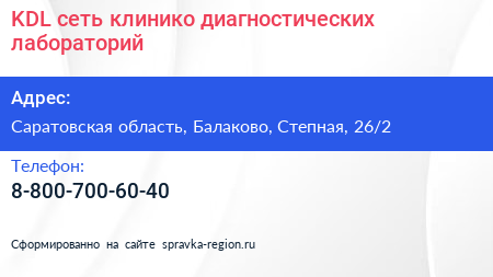 KDL, сеть клинико-диагностических лабораторий по адресу Саратовская область, Балаково, Степная, 26/2 в дальнейшем Организация, размещена в следующих категориях: