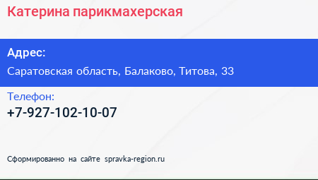 Катерина, парикмахерская по адресу Саратовская область, Балаково, Титова, 33 в дальнейшем Организация, размещена в следующих категориях:
