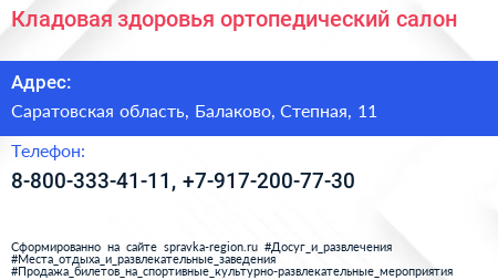 Кладовая здоровья, ортопедический салон по адресу Саратовская область, Балаково, Степная, 11 в дальнейшем Организация, размещена в следующих категориях: