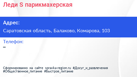Леди S, парикмахерская по адресу Саратовская область, Балаково, Комарова, 103 в дальнейшем Организация, размещена в следующих категориях: