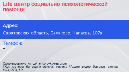 Life, центр социально-психологической помощи по адресу Саратовская область, Балаково, Чапаева, 107а в дальнейшем Организация, размещена в следующих категориях: