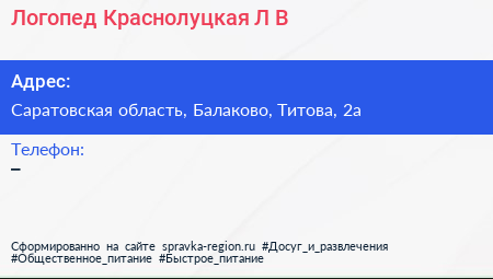 Логопед Краснолуцкая Л.В. по адресу Саратовская область, Балаково, Титова, 2а в дальнейшем Организация, размещена в следующих категориях: