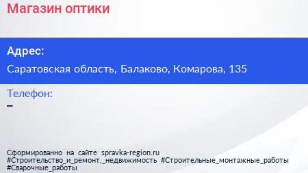 Магазин оптики по адресу Саратовская область, Балаково, Комарова, 135 в дальнейшем Организация, размещена в следующих категориях: